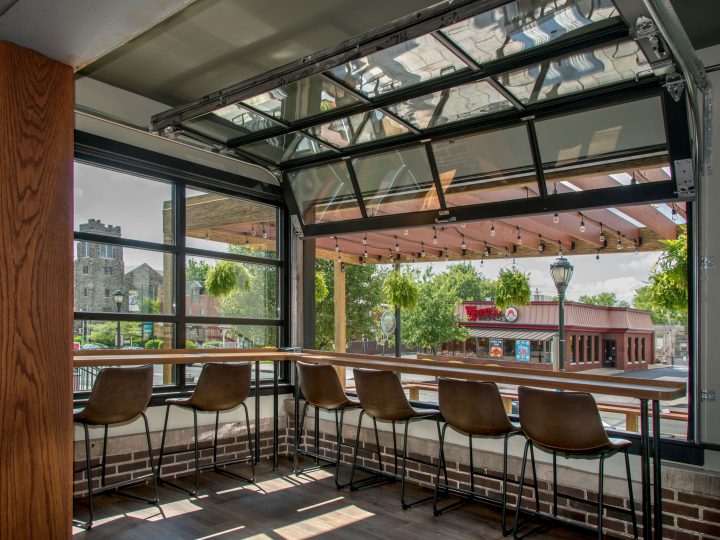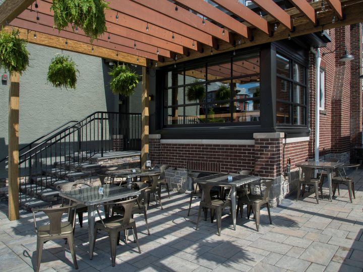 The front porch was outfitted with a full glass overhead door that opens up to connect the interior space to the brand new, wraparound paver patio on the front and side of the building. This patio ties into the existing beer garden at the building's rear. The final touch of this project was the small addition off th eback to accommodate the desired kitchen space.